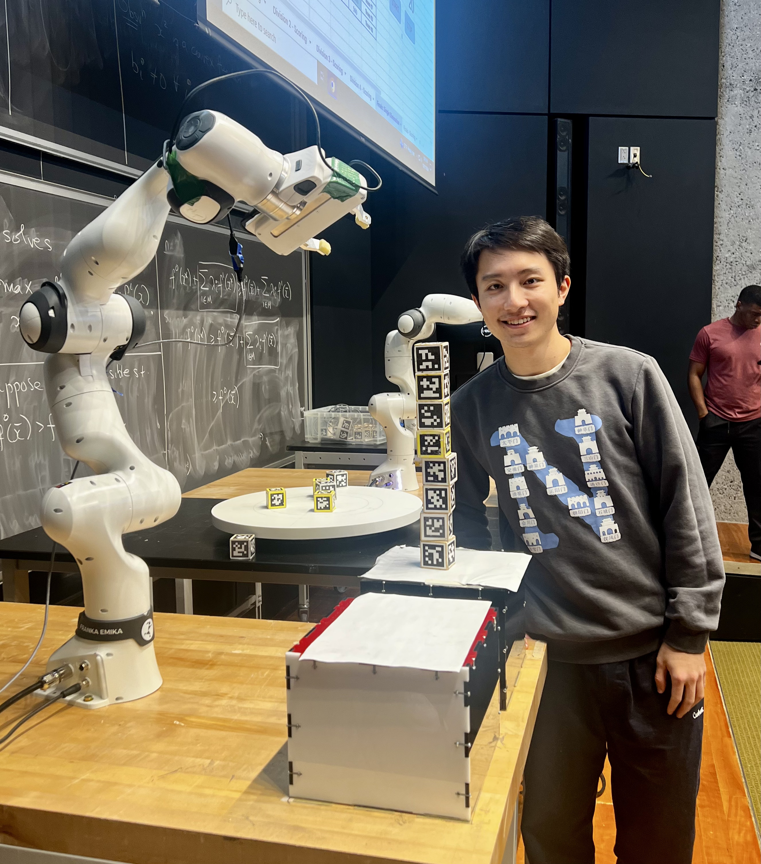 Left to right: Me with the Franka Panda arm and completed block stack, receiving the course winner award, and celebrating with the team.